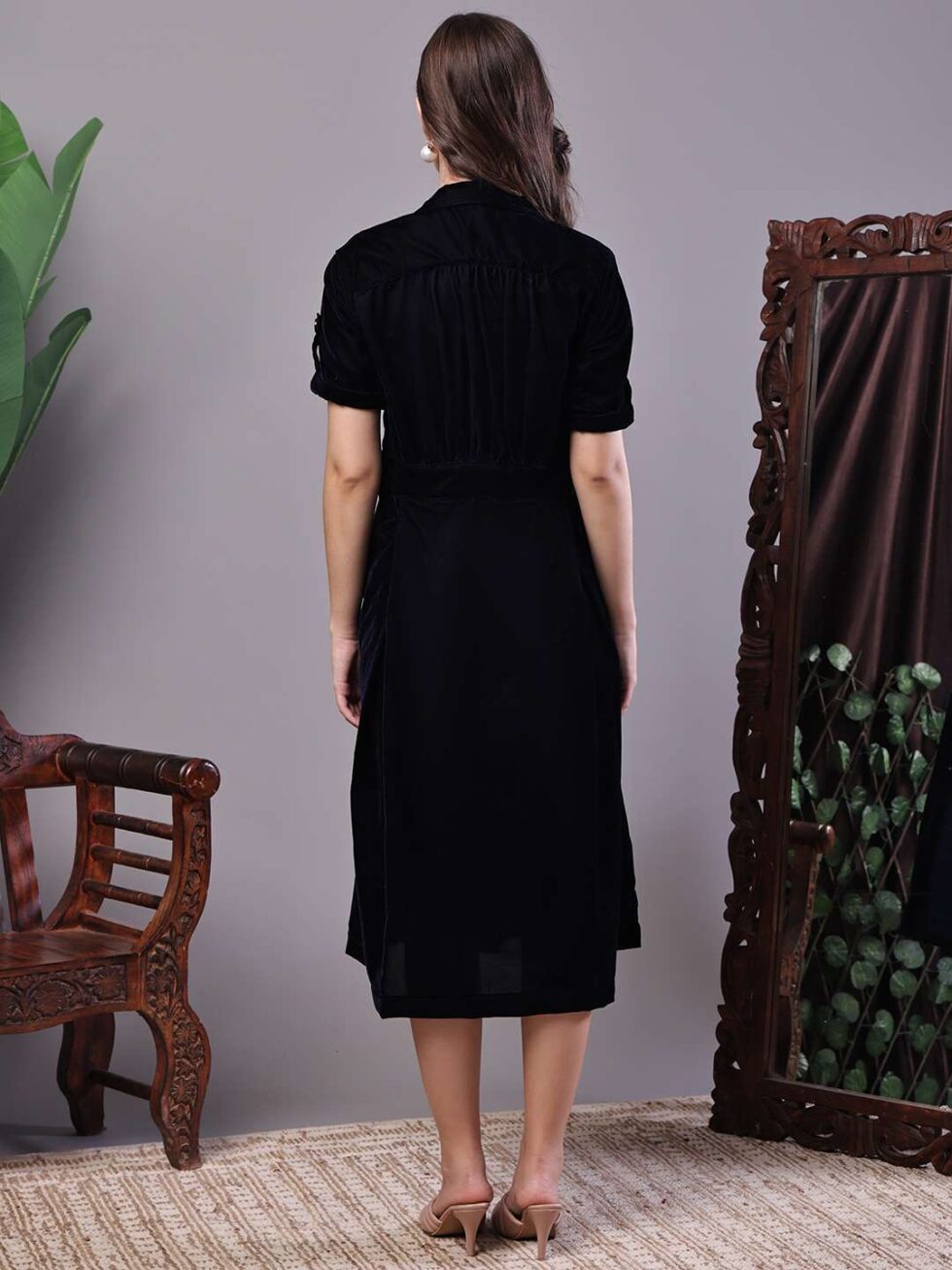 Women’s Black Velvet Solid Printed Shirt Midi Dress with Belt